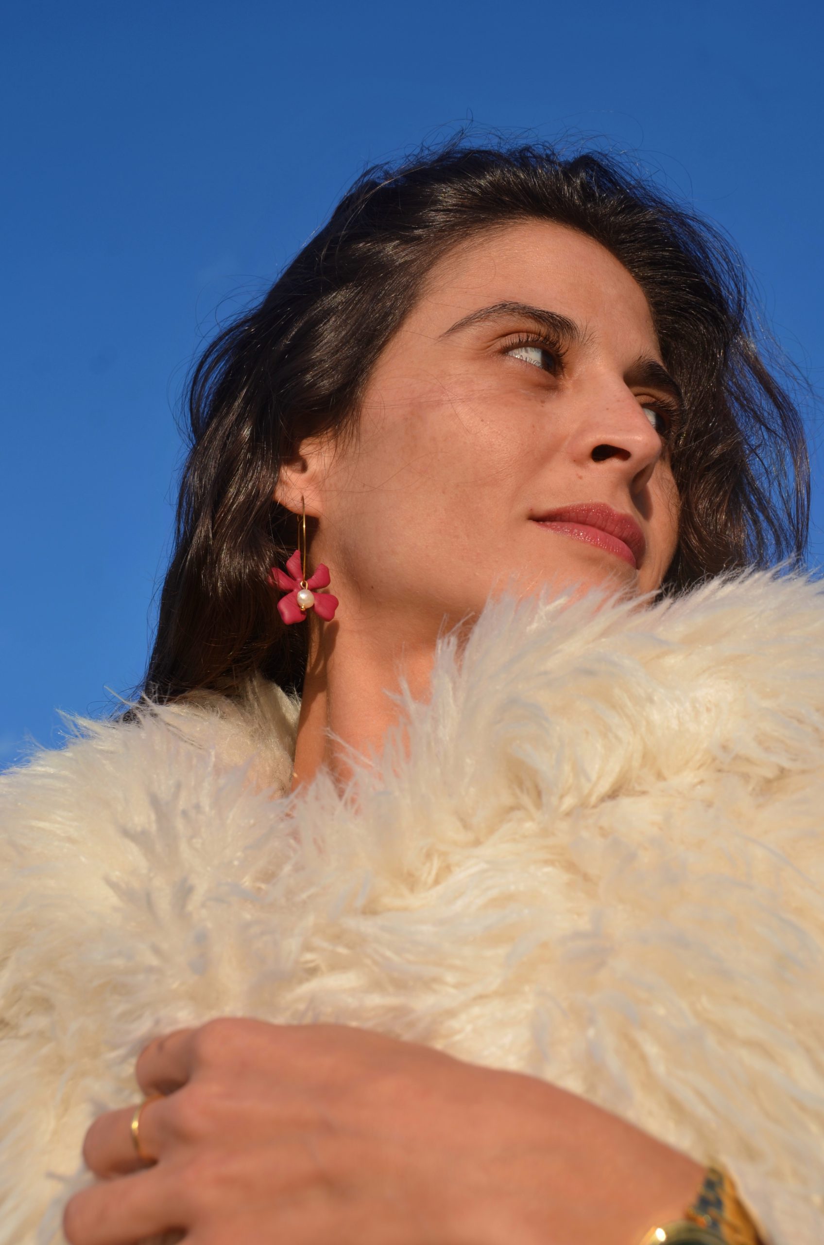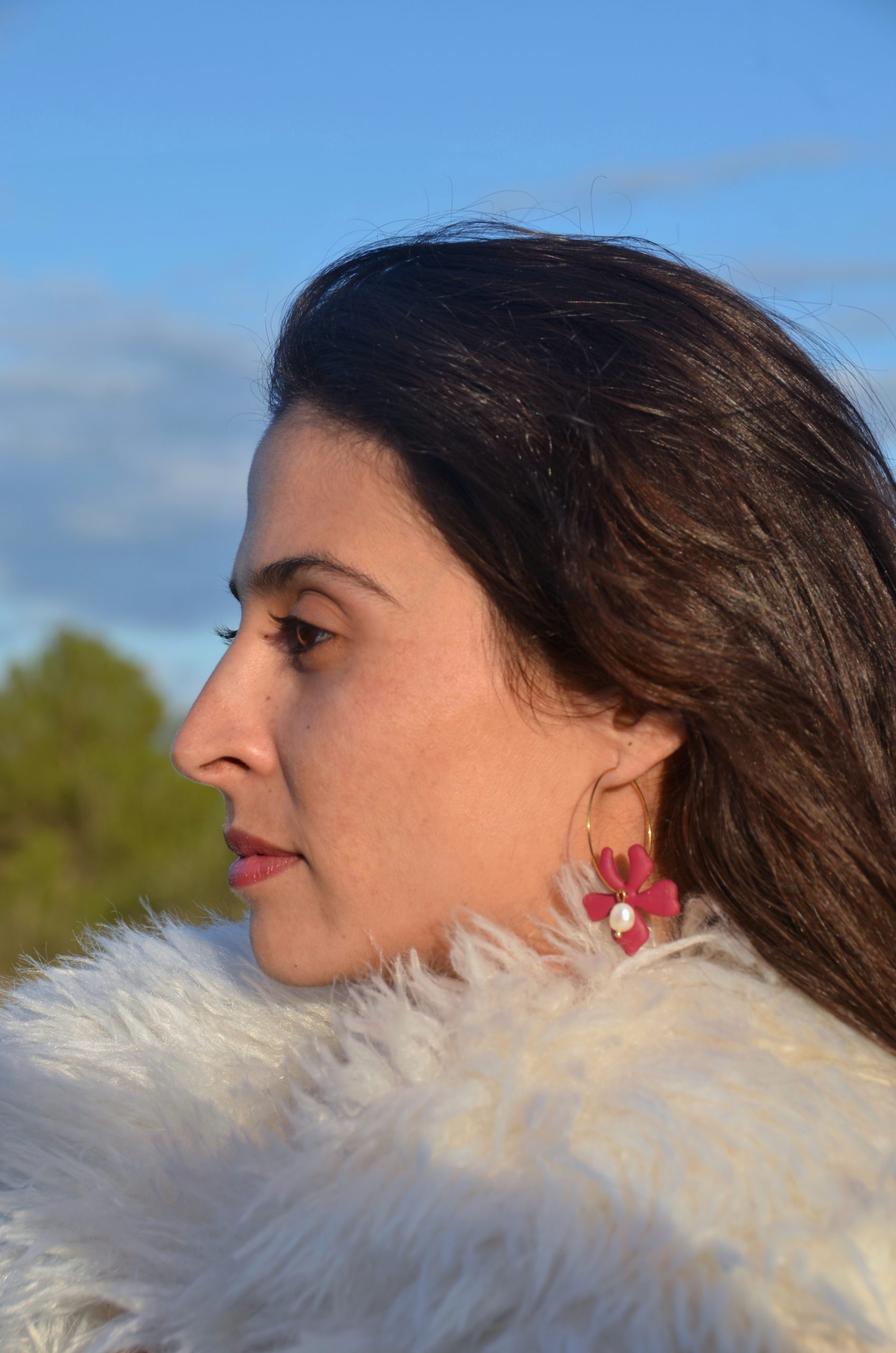 Las flores están modeladas en arcilla polimérica, un material ligero y cómodo que permite lucir volumen sin peso. Cada pendiente se completa con un arito de latón dorado y una perla de agua dulce intercambiable, para que puedas jugar con tu estilo según el día o la ocasión.